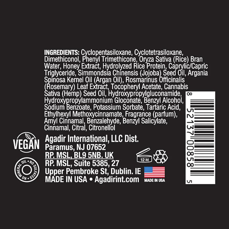 Cyclopentasiloxane, Cyclotetrasiloxane, Dimethiconol, Phenyl Trimethicone, Rosmarinus Officinalis (Rosemary) Leaf Extract, Oryza Sativa (Rice) Bran Water, Argania Spinosa Kernel Oil (Argan Oil), Simmondsia Chinensis (Jojoba) Seed Oil, Cannabis Sativa (Hemp) Seed Oil, Hydrolyzed Rice Protein, Honey Extract, Tocopheryl Acetate (Vit.E), Caprylic/Capric Triglyceride, Hydroxypropylgluconamide, Hydroxypropylammonium Gloconate, Sodium Benzoate, Potassium Sorbate, Benzyl Alcohol, Tartaric Acid, Ethylhexyl Methoxycinnamate, Fragrance (parfum), Amyl Cinnamal, Benzalehyde, Benzyl Salicylate, Cinnamal, Citral, Citronellol.