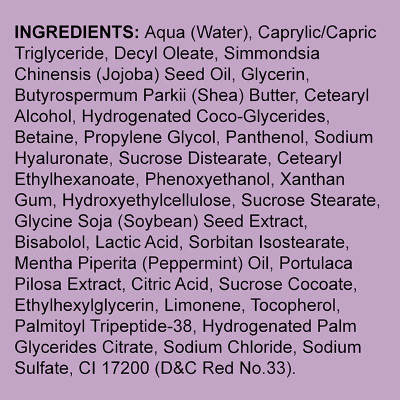 Key Ingredients: jojoba oil, shea Butter, hyaluron, peptides, kiss me quick blossom extract (portulaca pilosa extract), mint oil.