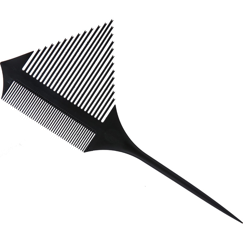 Double-sided balayage comb. One side features traditional tail comb teeth. Other side has ascending and descending teeth lengths to form triangle shape. Teeth have special hook tips, ideal for balayage.