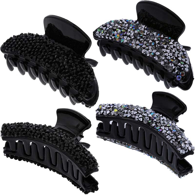 Claw clip adorned with strass on both sides of the clip in different alignment to create a unique, eye-catching design. The different positions allows light to bounce off at different angles to give this clip a sophisticated flair.