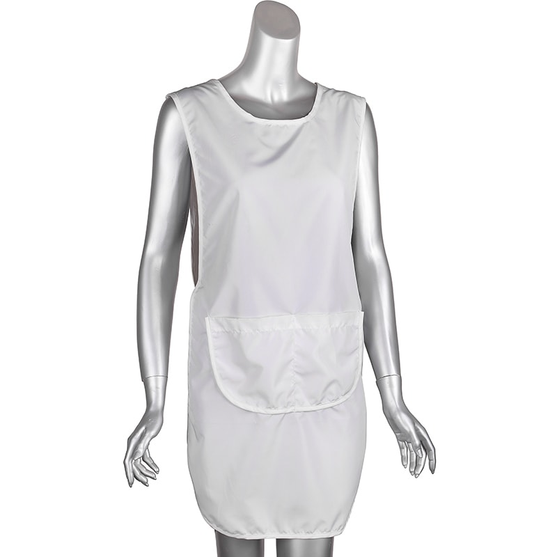 A 100% polyester pinafore with side-fastening Hook & Loop, medium size, white. Provides protection and coverage during spa treatments. Comfortable and lightweight polyester provides protection for midsection. Features pocket in front.