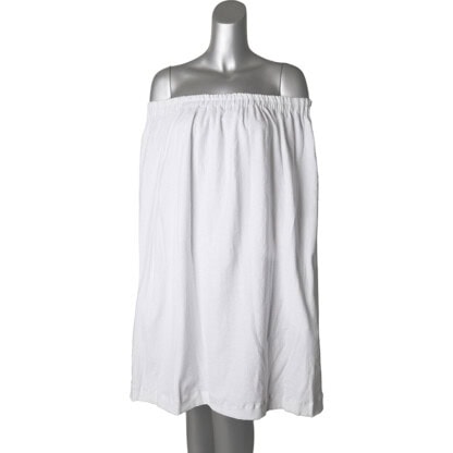 Simply pull over head and lay on body. Align elasticated area around collarbone area for comfortable wear and adjustment. A great minimalist form of coverage for spa treatments that can be easily removed when necessary. Made of soft cotton.