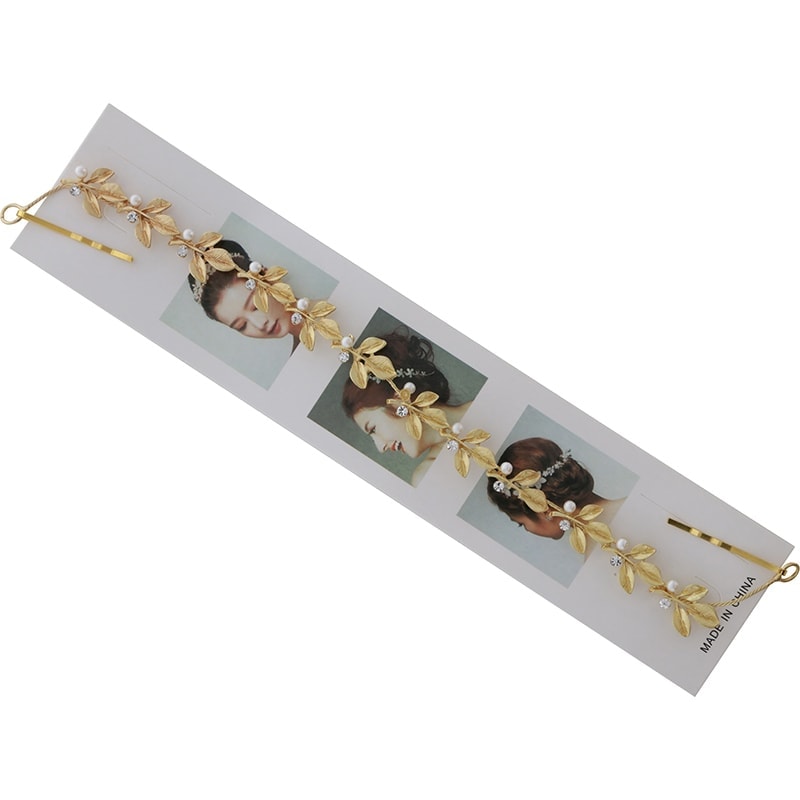 Trendy hair accessory, ideal for special occasions. A wrap-around gold leaf design, adorned with pearls for added elegance to any look. Its delicate leaf design is great for weddings and other special events. Features pin for additional support holding the accessory in place.