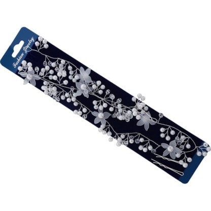 Sophisticated bridal hair accessory with soft colours to add elegance to any look. Made to branch design using wires, with diamantes and pearls on ends, and adorned with large flowers. Wraps around the hair and secured with pin for comfortable and secure wear. Great for weddings and other special events.