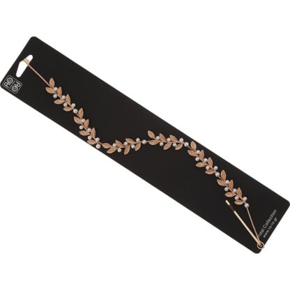A special bridal accessory with gold leaves and pearls at their base to transform a look into one more luxurious and sophisticated. At 32cm, this headpiece is shaped around the head and attached into place with included pins. Light reflects off leaves for eye-catching results.