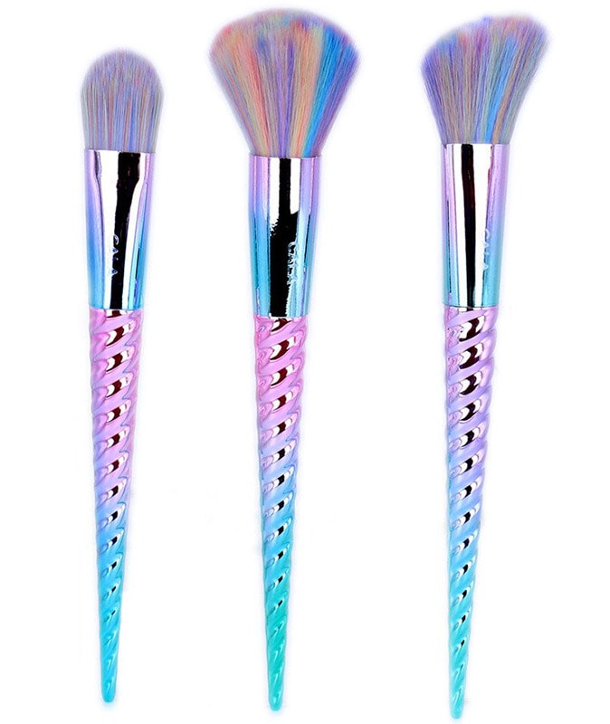 Sophisticated brush set with quality ombre, unicorn finish. Includes three brushes of different size and style for a comprehensive make-up brush set. A 3 piece premium brush set for a comprehensive collection for any make-up situation. Variety of sizes ensures for versatile make-up application from large areas to intricate contouring and blending. Package can act as a travel solution, making these brushes portable and easy for travel.