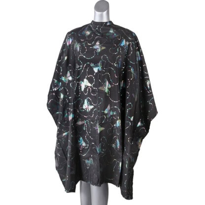 Black cape with a twist. Butterfly patterns have a metallic, iridescent finish that reflects in different colours depending on the lighting. Comfortable material for easy wear.