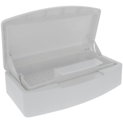 Fill container with sterilizing liquid and place tool inside to disinfect. Once finished, lift the tray with handle so the liquid can run out of holes. The tool can now be retrieved without making contact with the liquid.