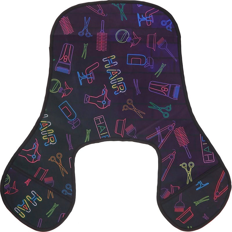Features neon designs of various salon tools. Comfortable material that provides protection and coverage during salon and beauty services.