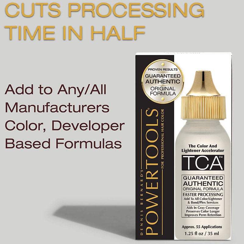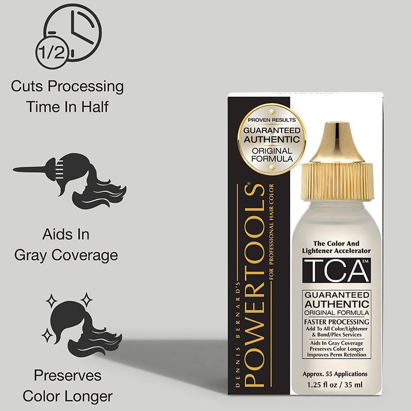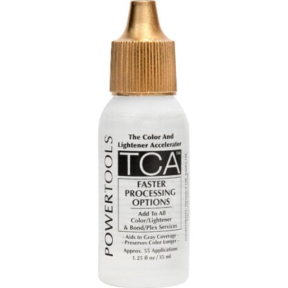 TCA is a hair colour additive that slows down the processing of hydrogen peroxide while driving colour molecules deeper into the hair shaft. Antioxidants allow TCA to help develop colour molecules completely in less time without compromising condition of hair. The hair cuticle opens faster and allows colour to deposit faster. Each bottle provides approximately 55 applications.