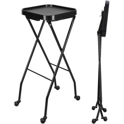 Compact, light, and space-saving trolley design with foldable tray section for extra storage. Ideal for small salons and workstations. Simply lift up tray to fold legs to store away trolley. Tray features an anti-slip finish to prevent tools, equipment and product sliding around. Fitted with wheels for easy movement.