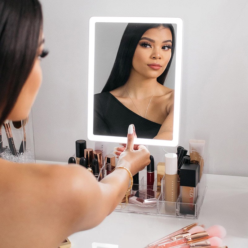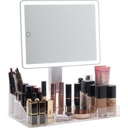 The all-in-one make-up station. This handy accessory combines the functionality of an LED mirror and cosmetics organiser in one place. No more hunting for the right make-up during sessions. Make-up is always within reach, and the LED mirror keeps shadows at bay. Mirror is separately attached to organiser.