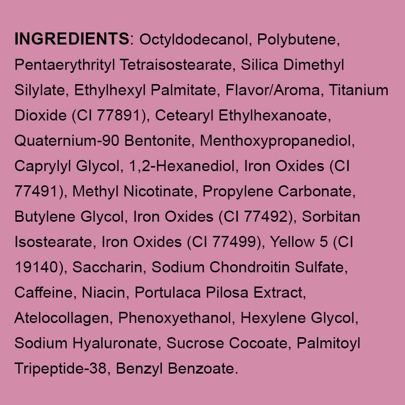 • Hyaluronic Acid: Moisturizes and improves firmness; helps stimulate plumping.