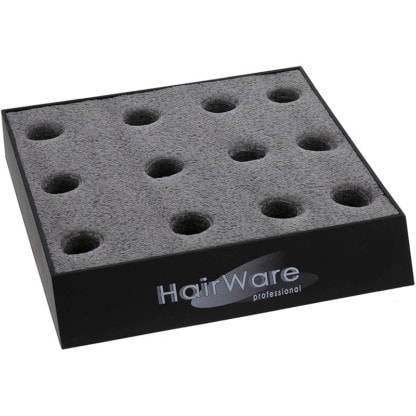 Sturdy Hairware stand to fit a maximum of 12 brushes. Display brushes upright for retail purposes. Soft foam bottom is flexible enough to accommodate a wide variety of barrel sizes.