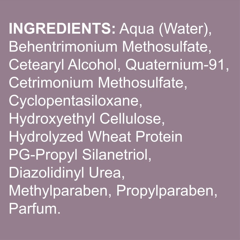 Detangles hair instantly. Gentle enough for daily use and is suitable for colour and chemically-treated hair. Leaves hair smooth and shiny.