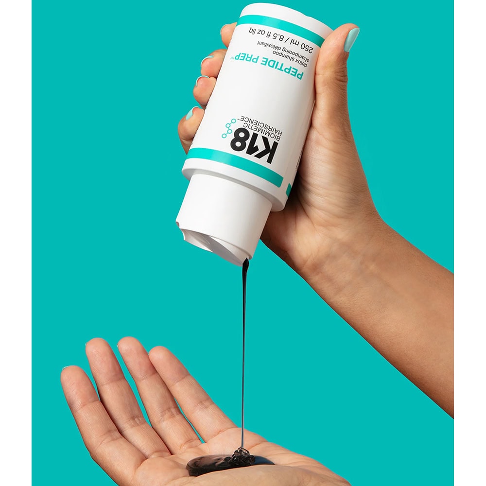Detox Shampoo is a heavy-duty clarifying shampoo that thoroughly clears away product and oil buildup on the hair, revealing a clean canvas and the most optimized hair environment for the K18PEPTIDE™ hair repair ingredient to work in the hair. Hair is left squeaky-clean and back to a healthy base.