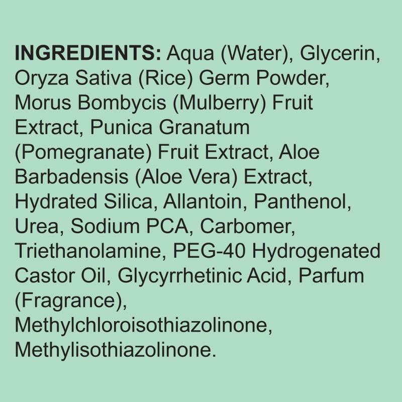 Benefits from extracts of Aloe Vera to moisturise, Mulberry to help improve skin tone and Pomegranate to help protect skin against environmental exposures. These active ingredients are known for their healing and soothing properties, making this exfoliator ideal for sensitive skin types. Leaves skin feeling soft with a youthful appearance.