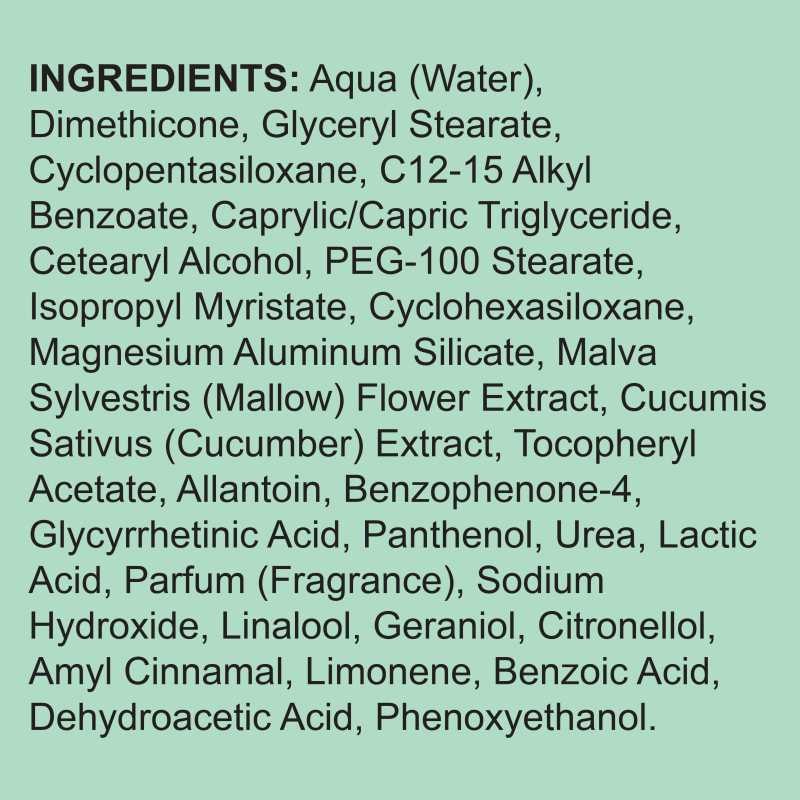 Extract of Mallow and Cucumber help to moisturise and hydrate the skin, providing protection throughout the day to help with the delicate balance of oil production across the face. Vitamin E helps to protect the skin against the environment, particularly against humidity extremes which is a common cause for an imbalance of oil production on oily/combination skin types.