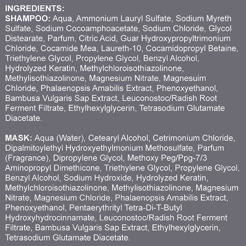 Travel set of the Keratin range, featuring mini sizes of the shampoo and mask. This is a protein and keratin-based regimen for restructuring treated or damaged hair to moisturize, deeply nourish and restore to its healthy vitality and integrity.