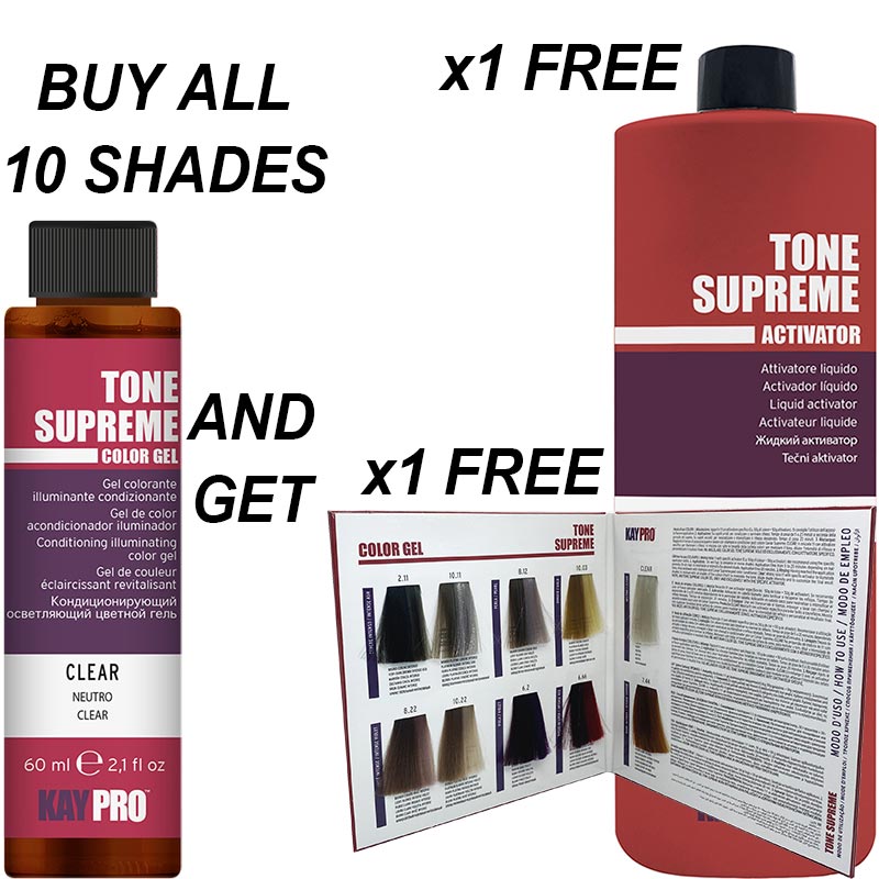 Tone Supreme is a demi-permanent conditioning color gel to refresh and tone hair color, all while leaving hair glossy and shiny. With the addition of caviar extract and fermented radish root, this is done without damaging the hair structure. Its acid pH restores the hair’s natural pH level, smoothing and sealing cuticles so hair feels silky and healthy. There are thousands of possible shades that can be accomplished with this gel. The range comprises of 9 colors and 1 clear option.