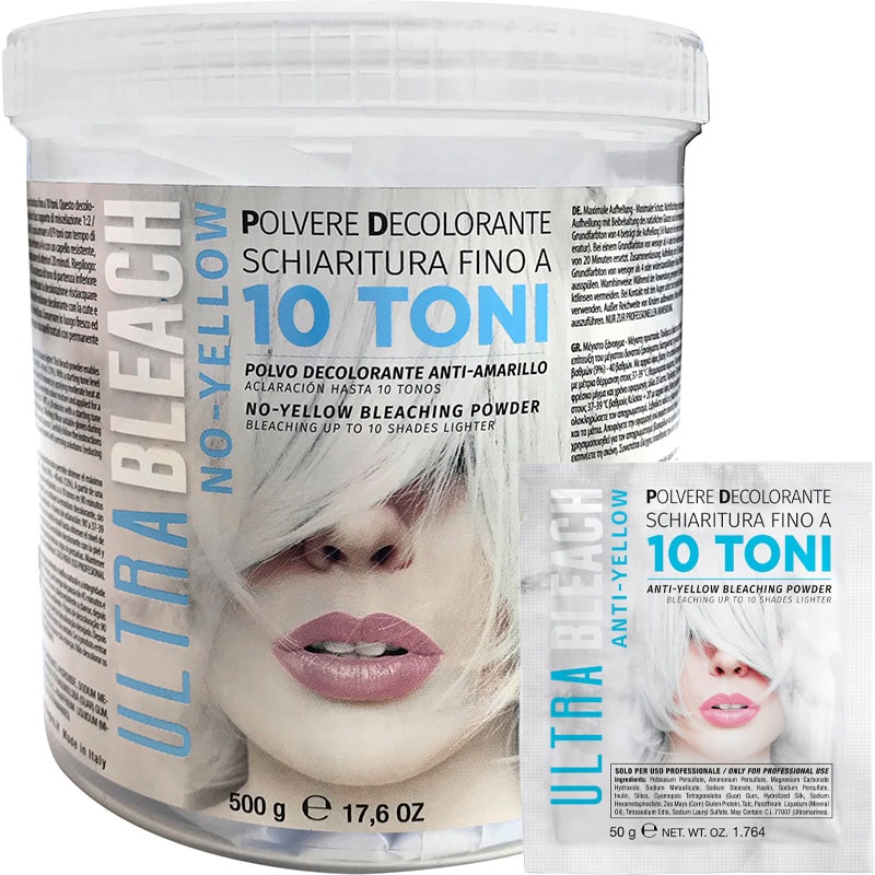An innovative powder bleach formula that can bleach hair up to 10 tones in a single step.