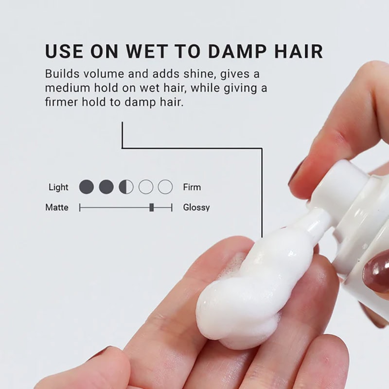 Scrunch, smooth or define – the choice is yours with this instant bounce builder. As the hair absorbs the foam, a protective shield is created around the hair shaft and works to close the cuticles. This provides protection for the hair to ensure the hair does not dry out or become damaged from UV rays. Colour-treated hair is also protected by sealed cuticles as it prevents unnecessary colour fade and washout. Simply apply 1-3 pumps evenly from root to ends. Blow dry for maximum volume and lift or let dry for added body.