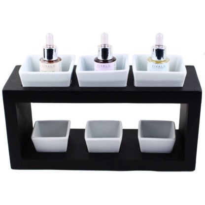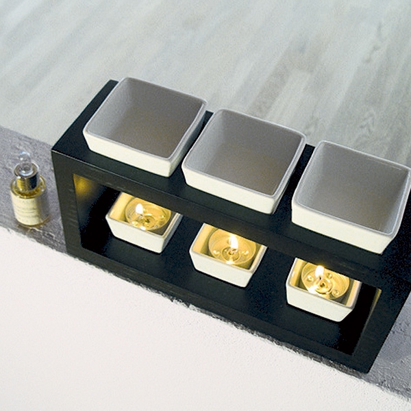 Trays made of porcelain. Ideally filled with water and a few drops of concentrated fragrance. Bottom porcelain trays are a perfect size for tea lights. Wooden framing maintains safety and effective use.