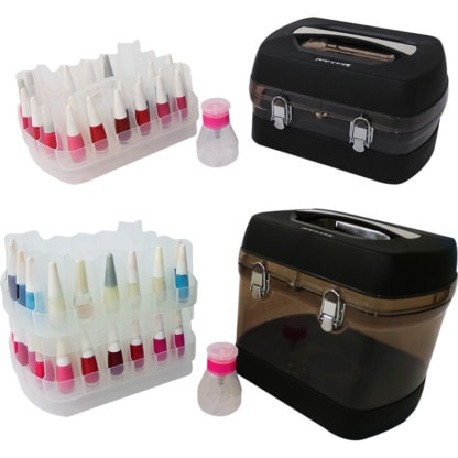 Tightly-packaged manicure and polish case for easy travel and storage of manicure and nail tools, products and polish. A compact, effective storage solution for transporting delicate and fragile nail products like nail polish. Includes specialised sections to keep polish upright and tightly packed together. Trays are removable for easy access during services and case is sealed tight with clips to keep contents safe and secure.
