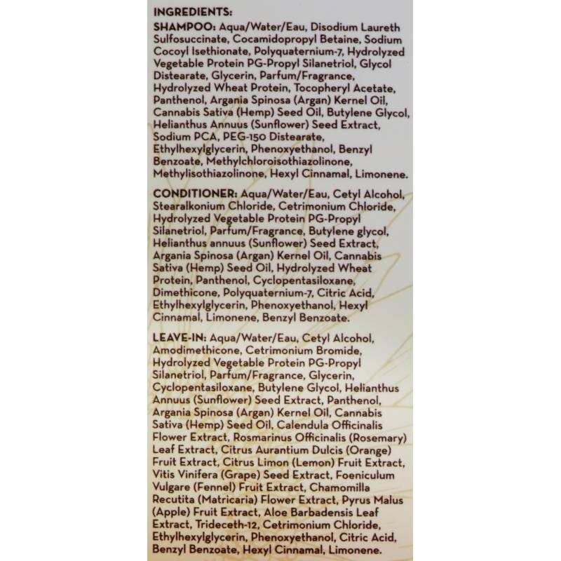 Products contain both Hemp Seed Oil and Argan OilWHY?Hemp Seed Oil has been named “Nature’s most perfectly balanced oil”, as it contains the perfectly balanced 3:1 ratio of Omega 6 (linolei/LA) to Omega 3 (alpha-linolenic/LNA) essential fatty acids. Hair, skin and nails are all formed from the same line of dermal cells. People who use hemp seed oil typically report thicker and shinier hair, softer skin and stronger nails. Since hemp seed oil is nearly identical to our own lipids, it is capable of penetrating our cells and lubricating the surfaces between them. Often called ‘liquid gold’, Argan Oil is a product extracted from the kernels of the argan tree, which is native to Morocco. It is extremely rich fatty acids and vitamin E. Its properties make it particularly beneficial for the hair and skin. Above all, the combination of Hemp and Argan Oils provides added nourishment to your hair and body. |