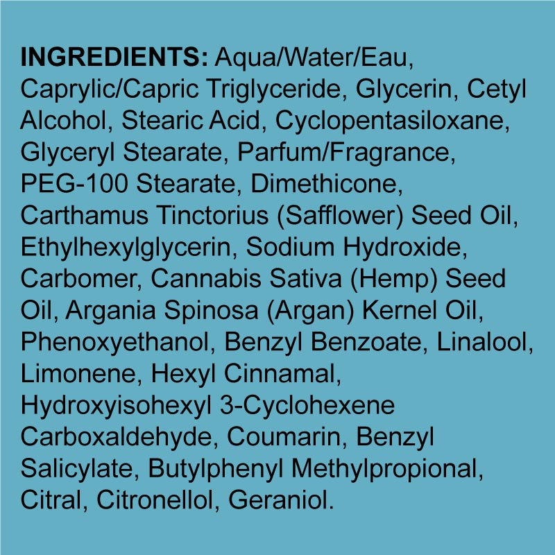 • Argan, Hemp and Safflower Seed Oils provide moisturization and soothing properties