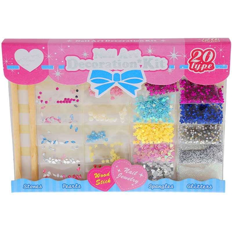 Includes assorted nail jewellery such as stones, pearls, spangles and glitters. A total of 20 types of nail art to suit whatever occasion.