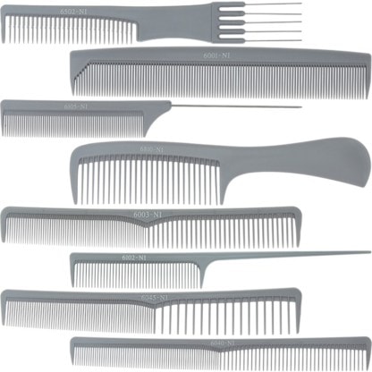 Nano Ionic Comb with flexibility. A variety of comb styles and sizes available. Helps hair retain moisture and shine. Seamless surface inhibiting bacterial growth with anti-static properties.