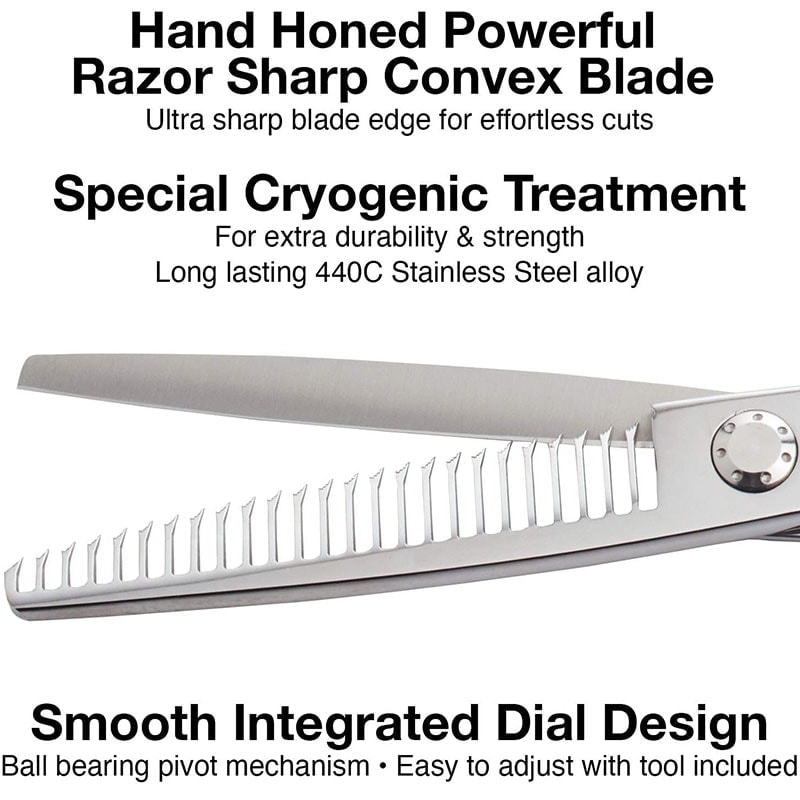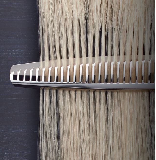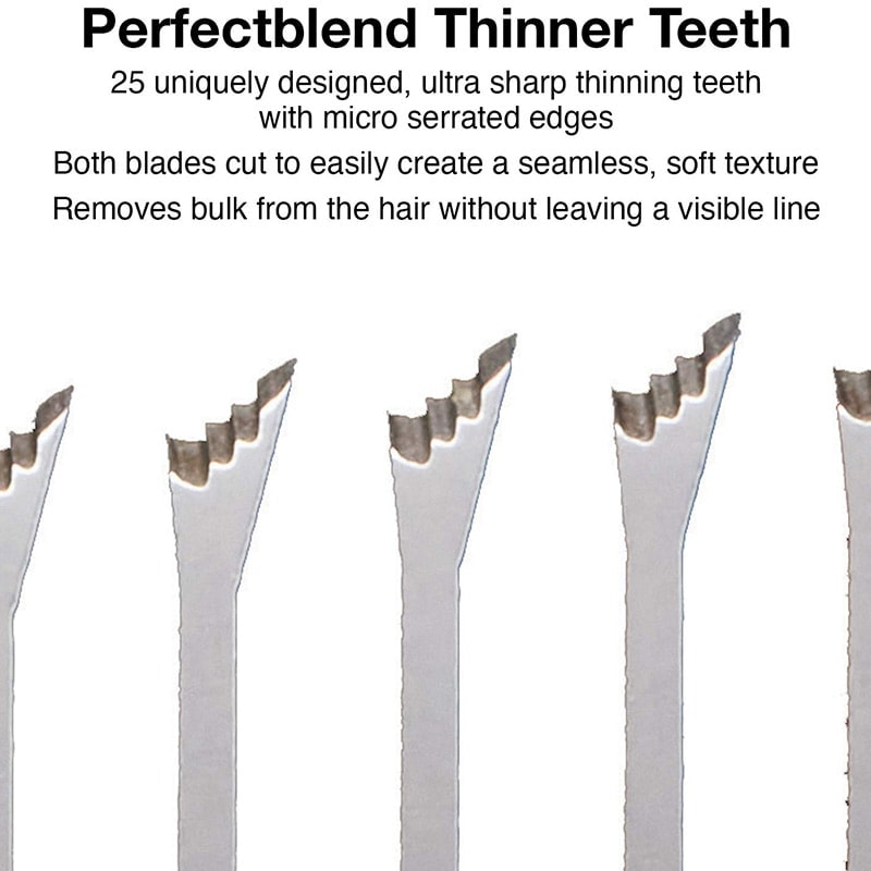 PerfectBlend™ Thinner Teeth![]() 25 unique teeth, ultra-sharp wit micro-serrated edgesBoth blades easily create seamless, soft textureRemoves bulk from hair without leaving a visible lineHand-honed powerful convex bladeSpecial cryogenic treatment for durability and strengthTraditional thinner teeth cuts all hair in a straight line, leaving visible lines in the hair |