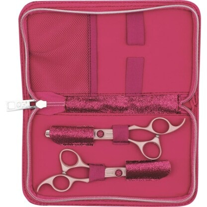 Stylish design scissor and thinner set that is ideal for any cutting situation. Long-lasting, razor-sharp edge, sturdy design, ergonomic grip and durable materials. Powerful convex blade with ergonomic handle design. Special thumb curvature keeps hand relaxed to eliminate fatigue. Exterior finish protects against nickel allergies.