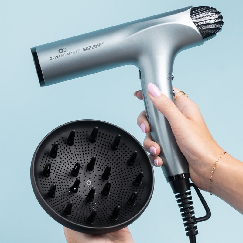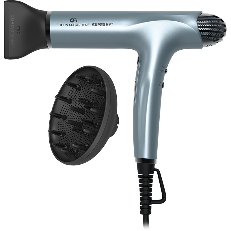 The SuperHP™ includes a concentrator nozzle for powerful, controlled & even airflow, diffuser with 13.3cm diameter to gently dry while creating shiny curls or beautiful waves without heat damage or frizz, and a cleaning brush to clean the internal filter.