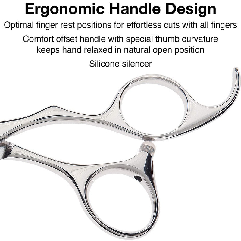 The offset position of the two scissor rings relieves tension in the muscles of the arm, neck and shoulders. Cutting becomes comfortable and effortless.