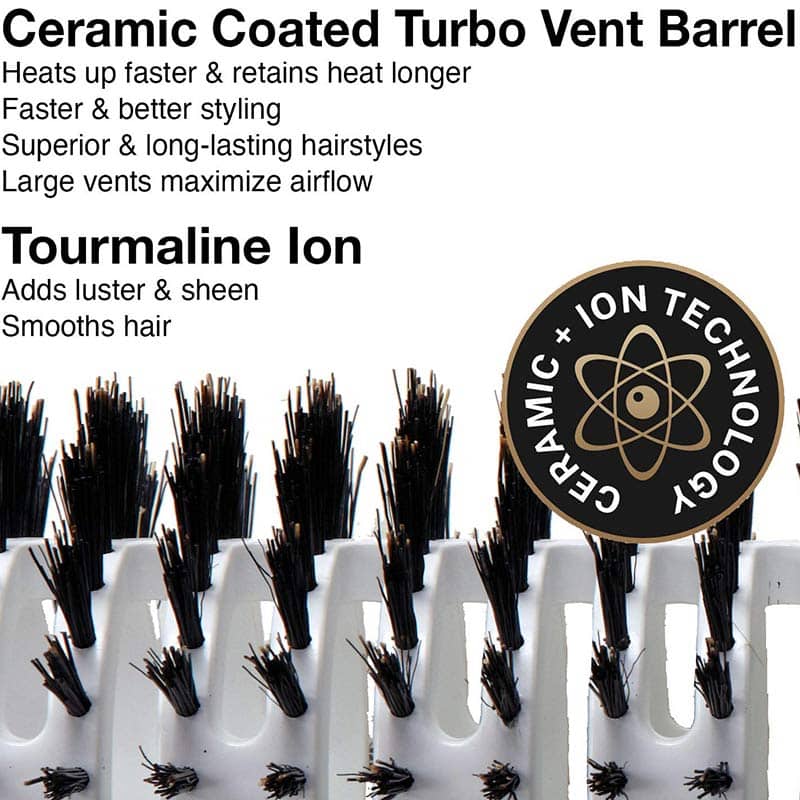 Anti-static. Ion-charged bristles. Comfortable ball point tips. Gentle on hair & scalp. Large vents maximize airflow. Create curls, waves or add volume.