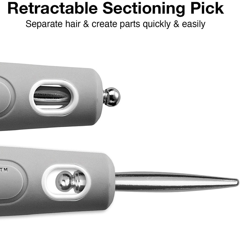 Snag-free neck ring. Ergonomic comfort grip. Lightweight for effortless styling. Retractable sectioning pick.