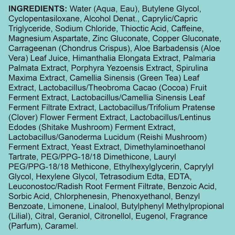 Cocoa Fruit Extract contains Vitamin C, Magnesium and Omega 6 fatty acids that keep skin looking healthy. Caffeine stimulates while Aloe Vera, Red and Brown Algae Nori Seaweed help skin appear soothed and hydrated. Shitake and Reishi Mushroom Extracts are potent antioxidants. Copper Gluconate is a mineral that firms and tones the skin’s appearance.
