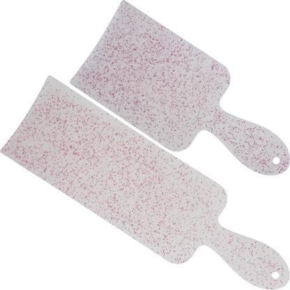 Colourful spatula for various tinting work. Soft pink shade with glitter inlay. Curved end and sturdy handle with hole for hanging storage.