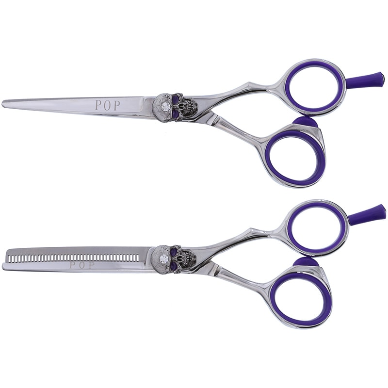 Narrow blade, lightweight, offset grip, serrated, removable finger-rest. Lined with purple in finger-rests. Comfortable, effortless cutting with stainless steel coating. Incredible sharpness, balance and performance with comfortable, ergonomic grip. Completed with polished, stainless steel finish with skull decorations. Long-lasting performance to suit any cutting requirement. An elegant and ergonomic shear with a uniform, stylist finish. A combination of style, elegance and performance. Incredible sharpness with long-term durability with no performance compromise.