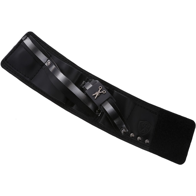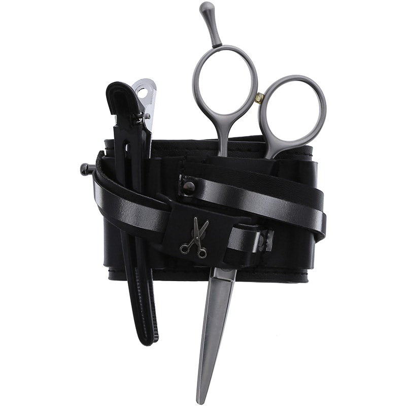 Wrist Cuff, narrow, 5.5cm, decorated with silver strap and gunmetal shear Armorizer®. Strap closes using Hook & Loop and features magnets to hold tools and a smooth, genuine leather shear strap to create a classic look. Unique strap configuration holds scissors, bobby pins, clips, make-up brushes, nail tools and combs or wear it on its own. Soft, durable and lightweight fit. Tools not included.
