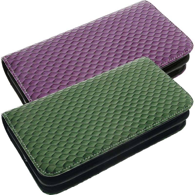 Shiny finish with textured, snake-like feel for added style. Features two zip compartments that reveal space for 4 scissors and 4 additional tools. Ideal for travel because of its compact, lightweight design with zip closure to keep contents safe and secure.