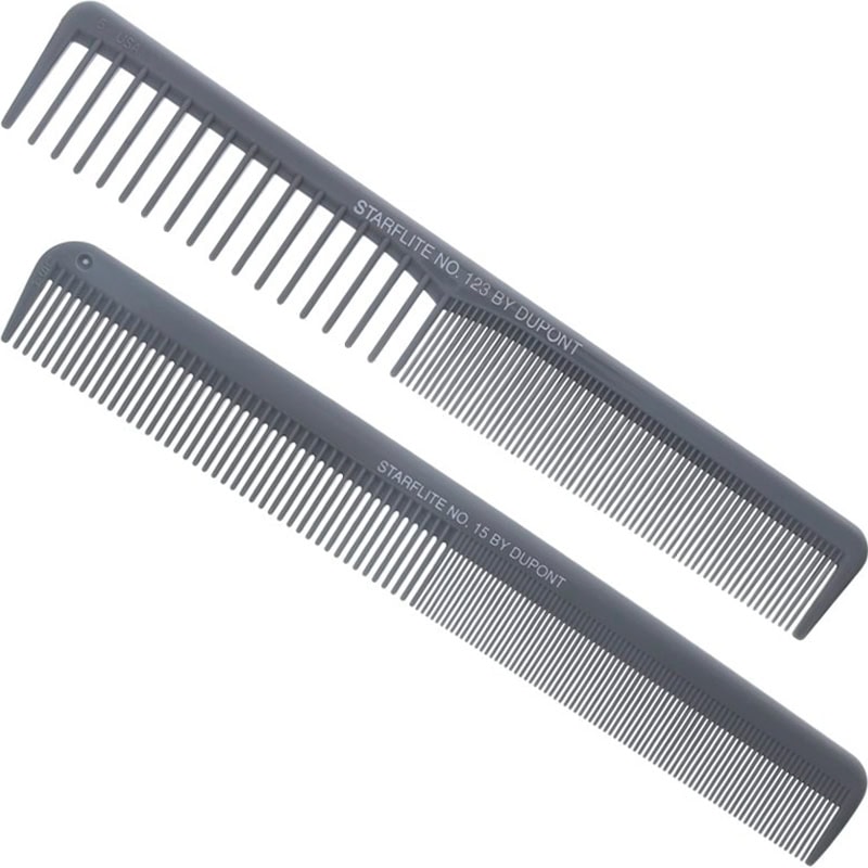 Starflite Combs are made from DuPont Delrin which create outstanding styling tools that are almost unbreakable. These combs are durable, heat and chemical-resistant and anti-static with smooth teeth and flexibility. These grey colored combs have become an industry standard.