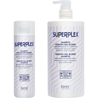 Superplex’s hair-saving system is now completed with an after-lightening toning booster. A blue-based Keratin Cool Blonde shampoo with special boosting keratin properties. A combination of Superplex’s classic hair bond repairing ingredients with the addition of blue-violet pigments for bleached, blonde, silver and white hair to reduce unwanted yellow and brassy tones.