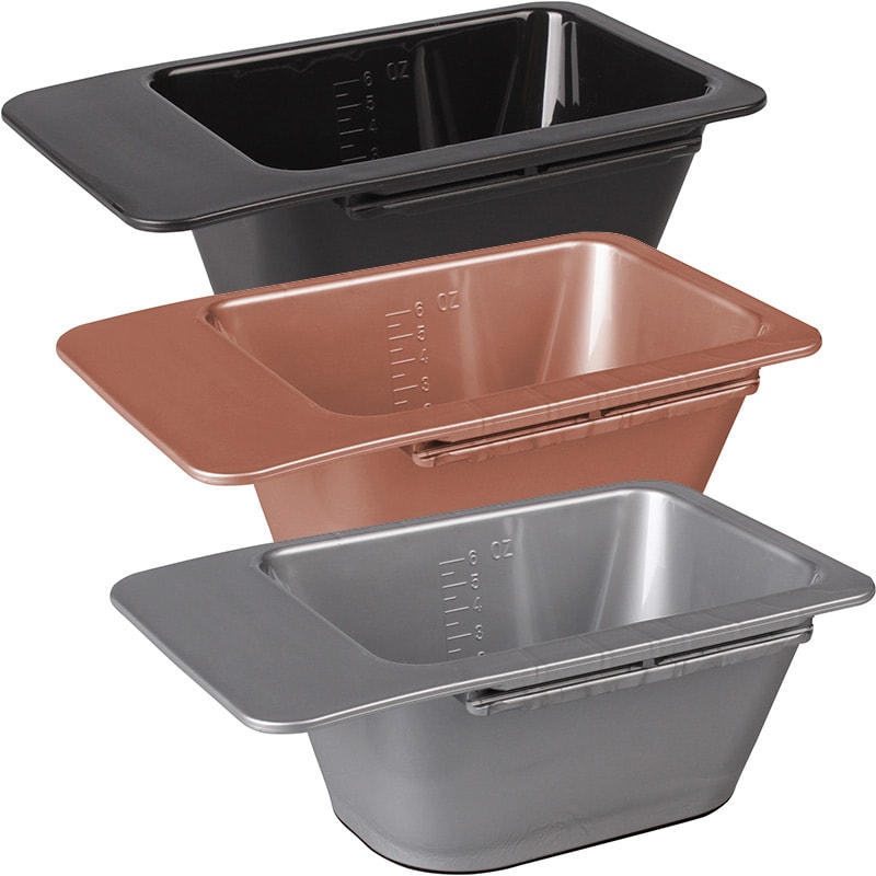 Rectangular tint bowl with volume markings in ounces. Sturdy design with handle lip and attachment slots on sides. Stylish, modern design with shiny finish.