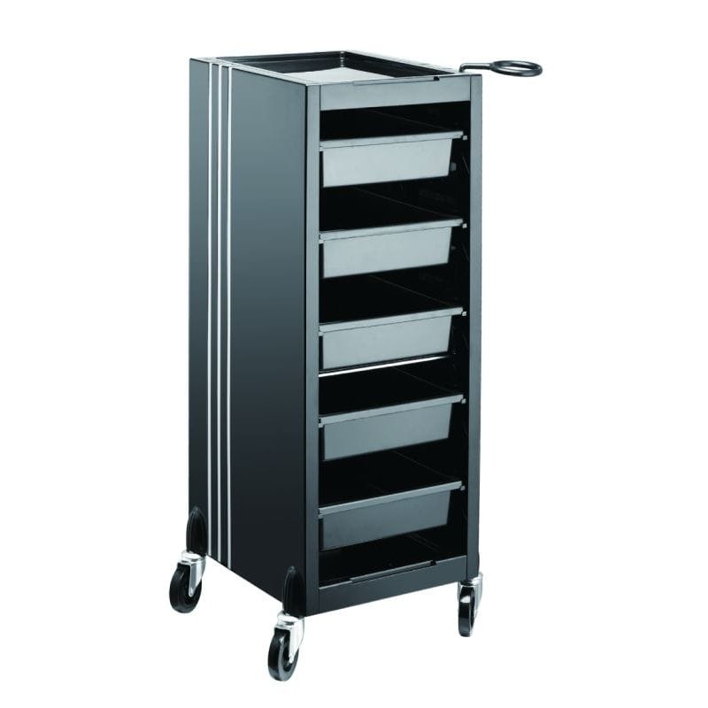 Protect your tools and equipment with this trolley. With its sturdy sides, no product will tumble out and get damaged. Features 5 removable trays, and 1 top tray. Lots of space for equipment and tools. Features dryer holder attachment at top. Ample maneuverability with wheels.