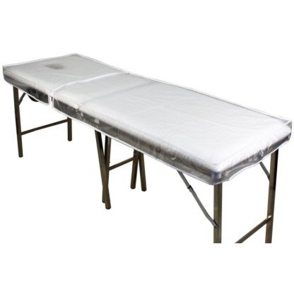 Elasticated to protect bed. Ensures cleanliness and hygiene for all services and protects bed against product and chemicals. Vinyl material easily cleaned for future use.